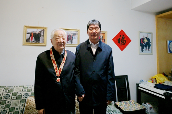 一進家中,趙廷周親切地拉著黃釗的手,詳細詢問了老人的身體狀況和生活情況,感謝黃老為陜西地礦事業作出的貢獻。在祖國70華誕即將到來之際,趙廷周為黃釗送去“慶祝中華人民共和國成立70周年紀念章”,并親自幫老人戴在胸前。趙廷周祝愿黃老身體健康、精神愉悅、萬事如意、闔家幸福。