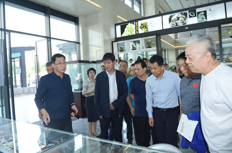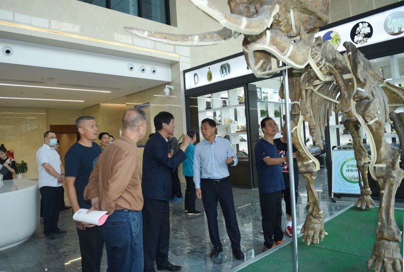 期間,趙廷周一行觀看了地礦集團在一樓大廳展出的漢江中國乳齒象化石和漢中玉文化產品。
