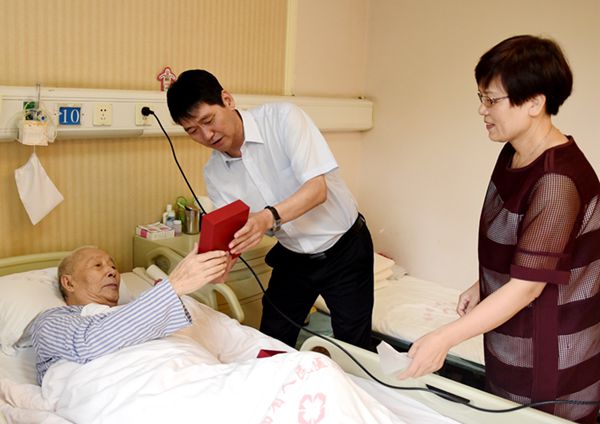 趙廷周總經理一行來到陜西省人民醫院病房,與躺在病床的石磊老人親切握手、促膝交談,關切地詢問石老的身體狀況和生活情況,并送上“中國人民抗日戰爭勝利70周年”紀念章和慰問金。趙廷周感謝石老這些離休干部曾為革命事業和新中國的地質事業所作出的重大貢獻,向他們表示崇高的敬意,希望他們保重身體,安享晚年。他叮囑隨行的有關部門負責人,離休老干部是黨和人民的寶貴財富,要關心照顧好他們的生活,幫助解決實際困難,確保生活、政治等各項待遇落實到位。