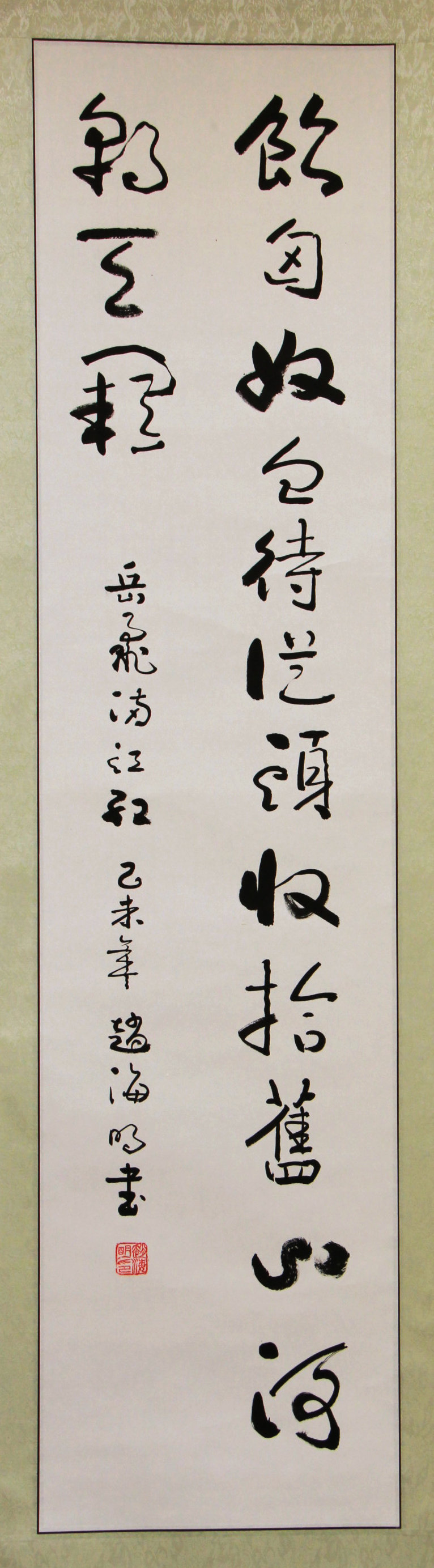 趙海明小時受父親影響,喜歡書法,刻苦摹練。1983年,他從野外調回八隊隊部,即買字帖不停臨習,常在春節時到隊部附近的村鎮寫春聯。退休后在長安上老年大學一年,多次受到書法名家曹伯庸、葉濃等指點。他數十年筆耕不輟,在臨習歷代書法名家基礎上逐漸形成個人風格。曾在長安步行街擺過地攤,在書院門與人合伙開過門市,負責提供書法作品,同時結交不少書友,經常互相切磋技藝。