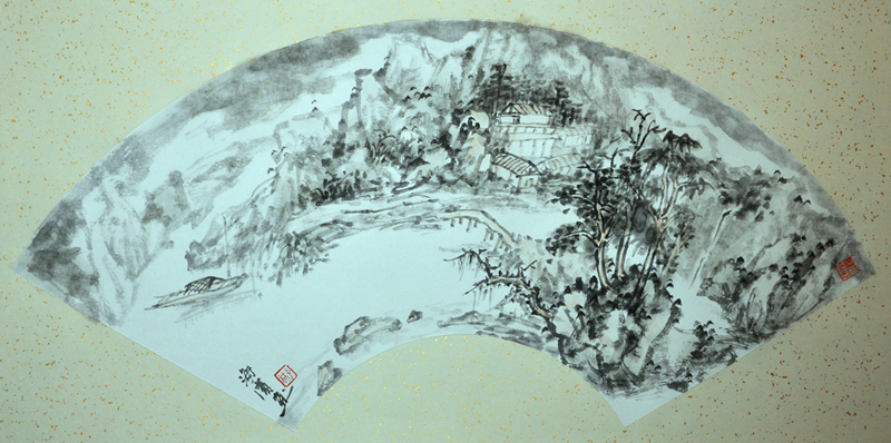 從鞏海賓的作品中,我們可以感受到什么呢?山水畫之中若只有山水,那便不如去看自然中之真山水,正如同董其昌所說:“以境之奇怪論,則畫不如山水,以筆墨之精妙論,則山水絕不如畫。”山水畫之所以勝于真山水,就在于那筆墨之精妙中,在于敬亭與我相看不厭的留戀與愜意,在于那山水之中所包含的大道至美。以此來觀海賓之作,雖只一管之筆,橫涂豎抹,列千里于目前,放太虛于心中,于黑白淺絳之中,體雄健靈秀之氣,畫雖滿幅,疏密相間,山峰迎首,相盼相顧,白云慢移,澗水溪流,或有房屋,誰家庭院?落落于山中路旁,點點清秀,樹木之色,或有仙境之奇想,或有與古人妙談之感悟,身在畫外,卻已移步畫中,目在畫上,思與天地相接,筆墨絹素,早已忘卻,直追大道。