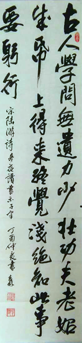 三十多年學習書法,我的體會是:1、愛好是第一位的。因為剛開始臨帖,從楷書入手,是很枯燥天無味的,如果不喜歡書法,很難堅持下來。2、要持之以恒。俗話說三天不寫手生,是很有道理的。我最喜歡陸游的一首詩:“古人學問無遺力,少壯工夫老始成,紙上得來終覺淺,絕知此事要躬行”。但是,因為一些客觀原因,三十多年來也是斷斷續(xù)續(xù)的,有時因為野外工作等原因,數(shù)月乃至一年都不摸筆的情況也是有的。所以雖學書三十幾年,自覺差的很遠,3、學習書法的步驟,我的主張是從楷書入手,繼而再涉及隸書篆書。我光楷書就學練了二十年,先是學柳,后又學顏,在顏體上下的功夫較多。隸書學過乙瑛碑、禮器碑,篆書臨過袁安碑、嶧山石刻,以及吳昌碩、鄧石如的篆書,但都未深入,漸愧?,F(xiàn)在有好些人學習書法急功近利,一開始就寫行草,光看到行草書花稍,流利,容易上手。孰不知沒有堅實的楷、隸、篆書的基礎,無論你怎么用功,是寫不好行草書的,寫出來的只是俗書,登不了大雅之堂。為什么現(xiàn)代人的書法趕不上古人,原因就在于此。